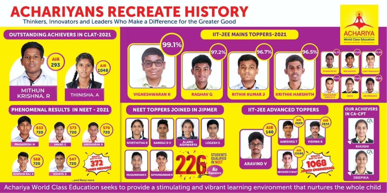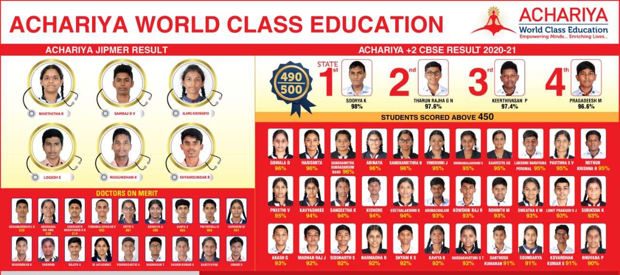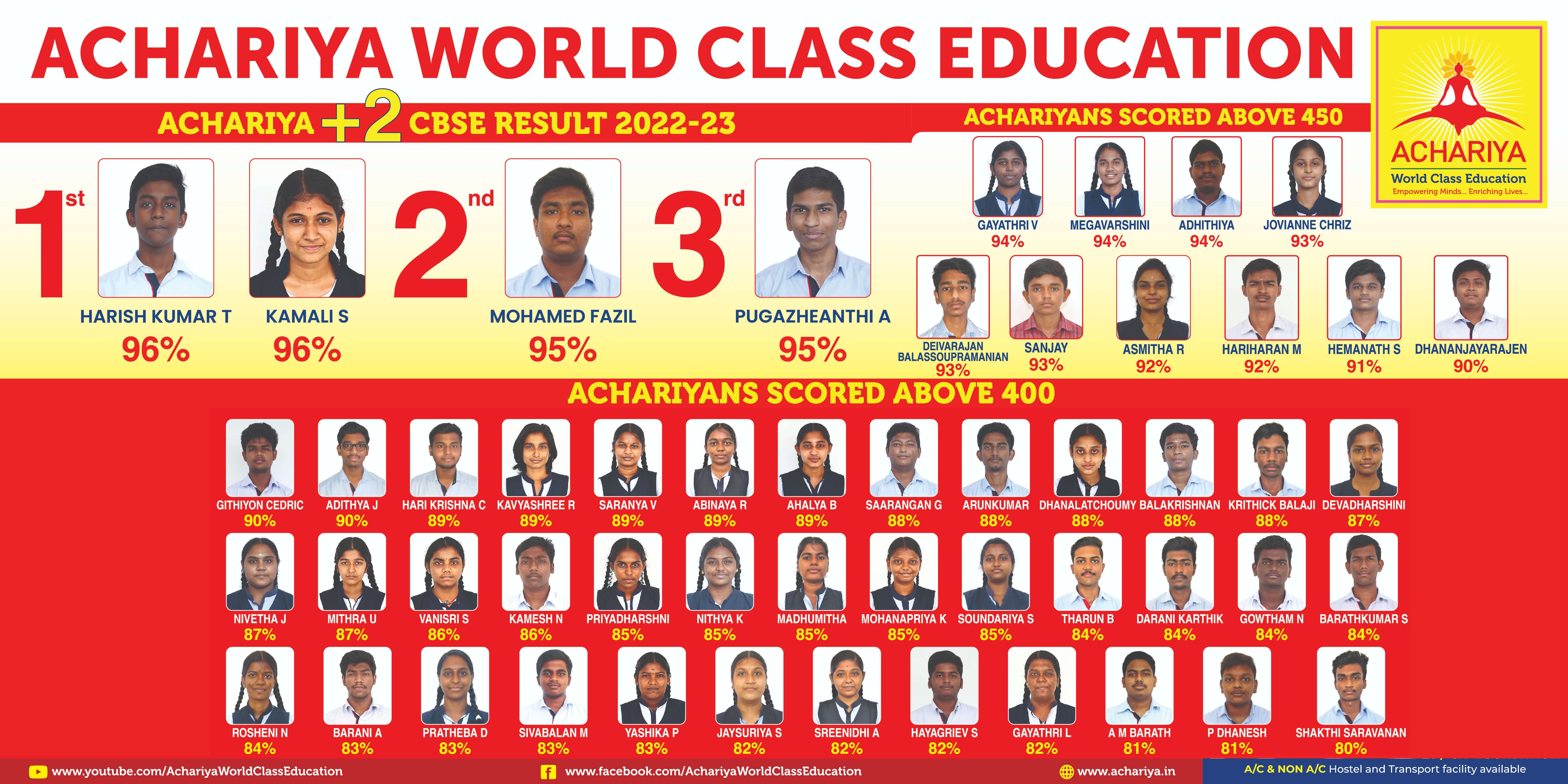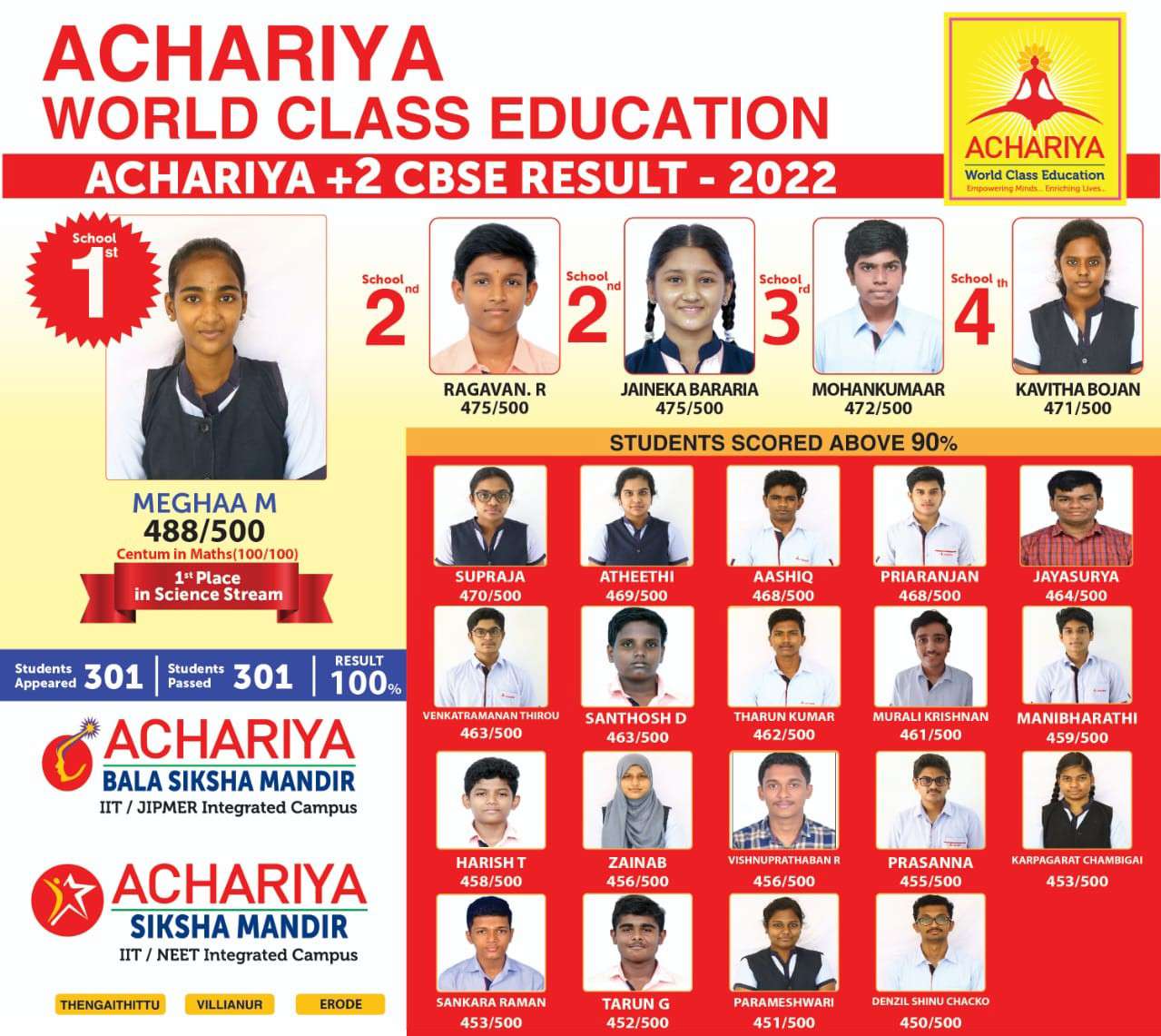 Results prove to we the backbone of any institution’s name and fame. We ACHARIYANS always deserve the honor of centum results in secondary and senior secondary exams. With the reputed appreciation from our parents, our institutions grows year by year, aiming to place ACHARIYA on the top of world.
